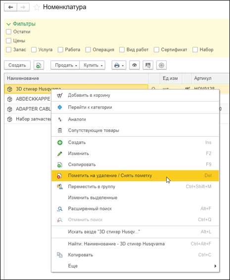 1. Пометьте номенклатуру на удаление