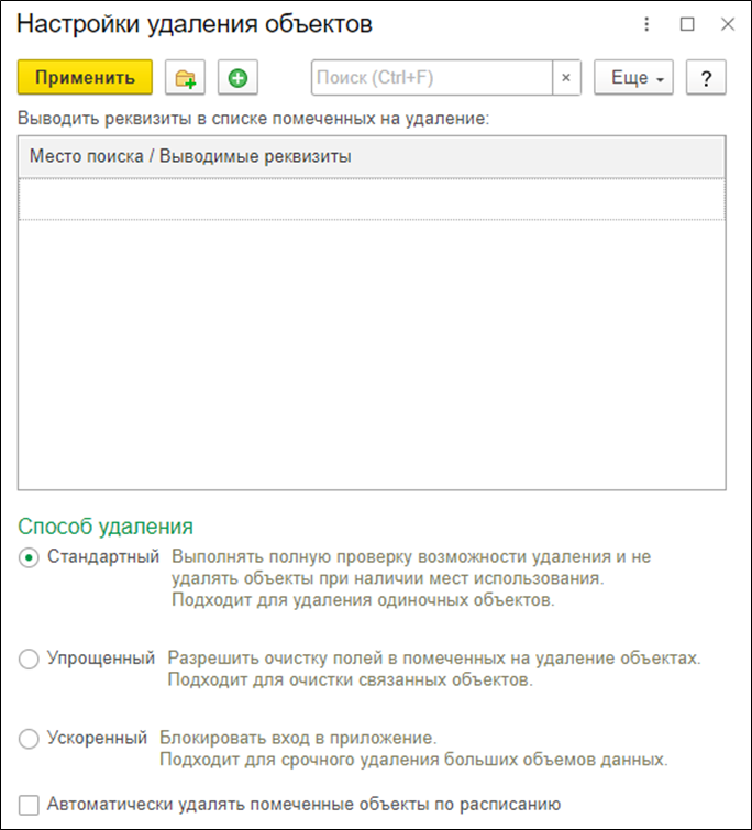 Если установить галочку в чекбоксе «Автоматически удалять помеченные объекты по расписанию», тогда система будет удалять объекты без вмешательства человека.